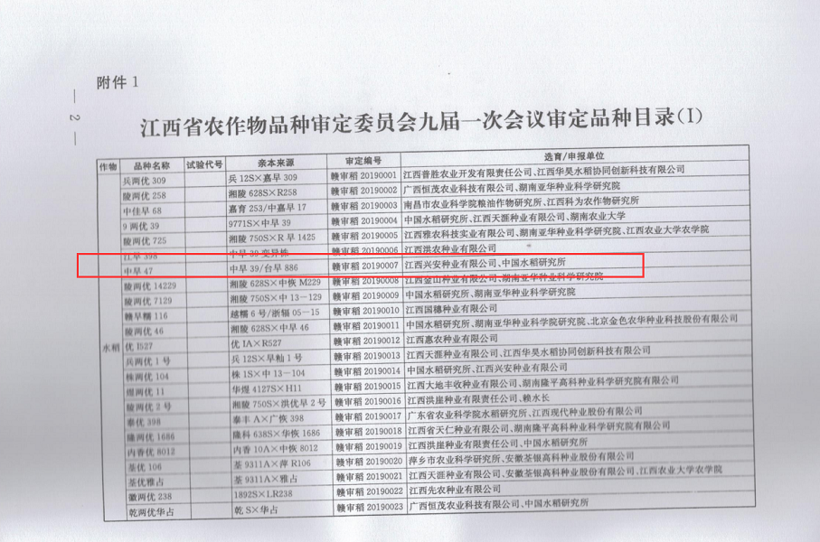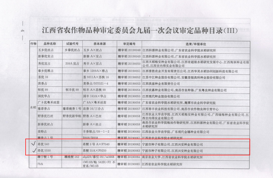 經(jīng)江西省農(nóng)作物品種審定委員會九屆一次會議審議,我公司水稻品種中早47、株兩優(yōu)104、七兩優(yōu)30、揚(yáng)產(chǎn)糯1號、甬優(yōu)540、甬優(yōu)5550通過審定。